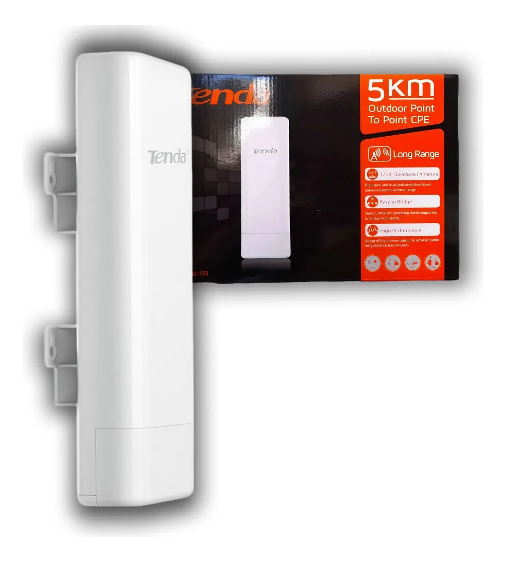 Tenda O3 Outdoor CPE 2.4 GHz (150 Mbps), antena direccional 12 dBi, amplificador 800 mW y carcasa IP64 resistente. Protección ESD/anti‑rayos, PoE y múltiples modos (AP/Station/WISP). Alcance de hasta 5 km.