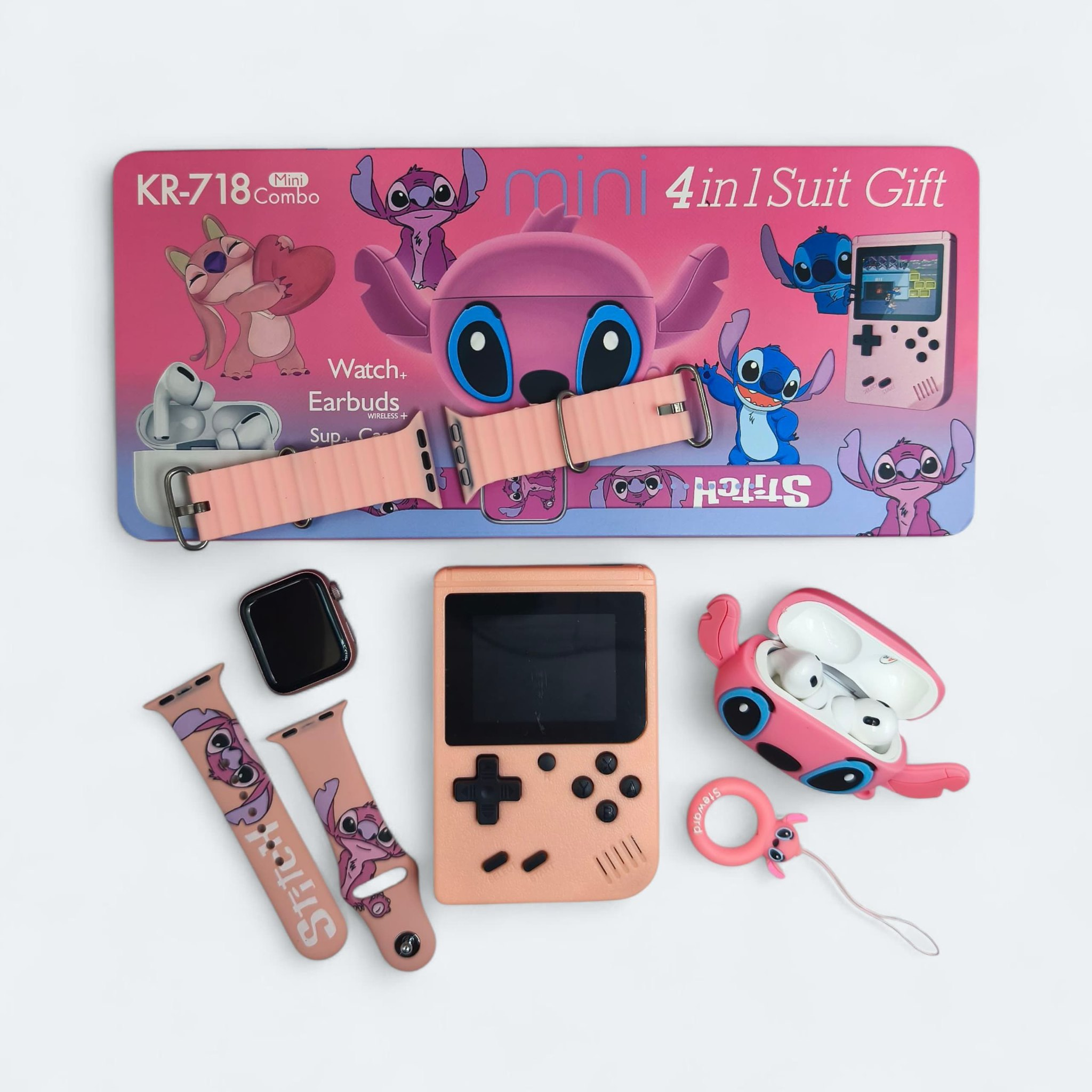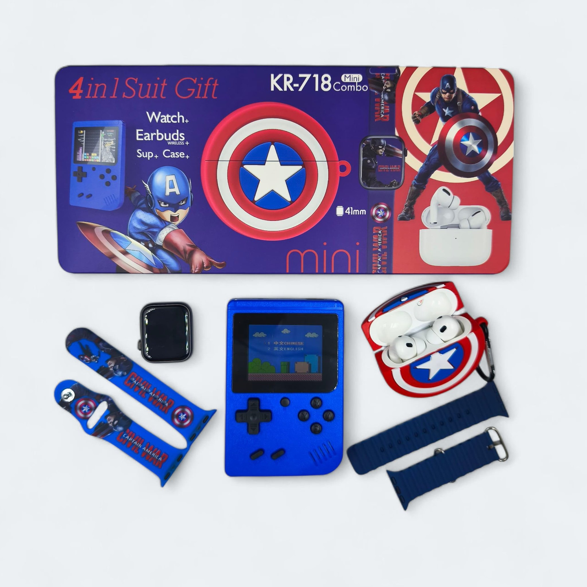 MINI COMBO SUIT GIFT KR-718 4EN1 WATCH + EARBUDS + SUP + CASE: El Mini Combo Suit Gift KR-718 4 en 1 es el regalo perfecto: incluye Smartwatch, Audífonos Bluetooth, Mini Consola SUP y Case protector. Disponibles en diferentes diseños y colores, ideal para regalar o consentirte con tecnología portátil en un solo paquete.