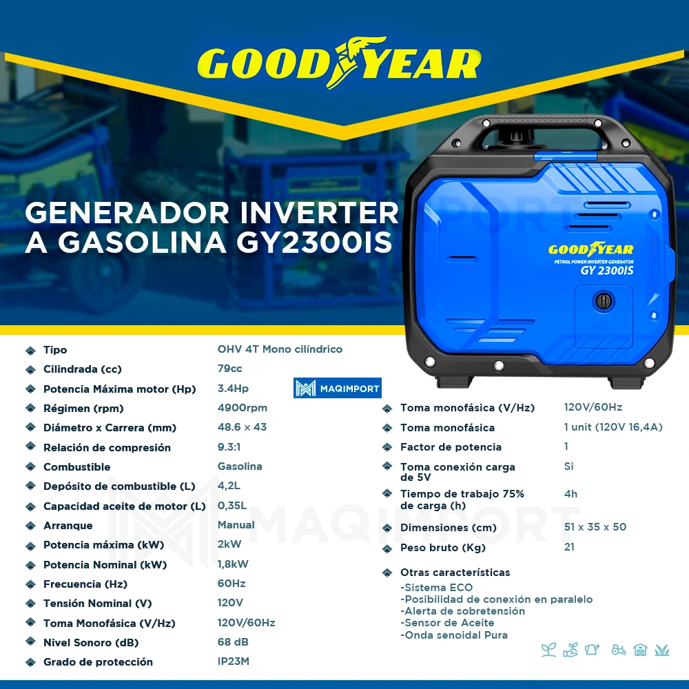 PLANTA ELECTRICA GOODYEAR GY2300ISD 2000W MAX INVERTER GASOLINA ARRANQUE MANUAL 110V: El generador inverter Goodyear GY2300ISD ofrece energía limpia y estable con 2000W máx., motor 79cc y funcionamiento silencioso. Ideal para emergencias, campamentos y equipos sensibles. Portátil, eficiente y con sistema ECO, protección por aceite y opción de conexión en paralelo.