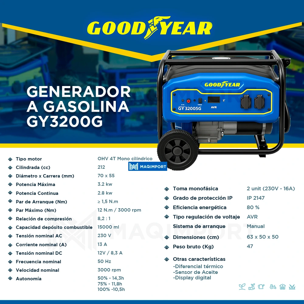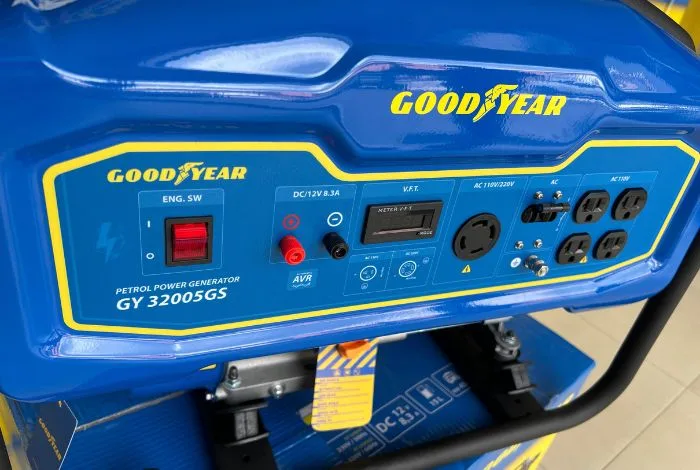 PLANTA ELECTRICA GOODYEAR GY32005GS 3200W MAX MONOFASICO ARRANQUE MANUAL 110/220V; La planta eléctrica Goodyear GY32005GS ofrece hasta 3200W de potencia máxima, motor 4T de 212cc y arranque manual. Ideal para emergencias, trabajos y uso en exteriores. Incluye AVR, protecciones contra sobrecarga, sensor de aceite y excelente autonomía para un rendimiento confiable.
