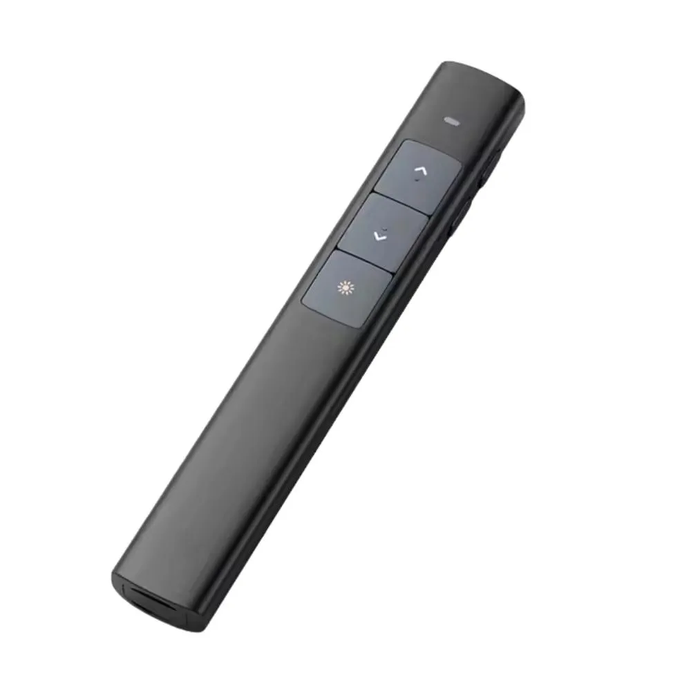 Presentador inalámbrico con puntero láser verde, conexión USB y botones intuitivos para avanzar o retroceder diapositivas.