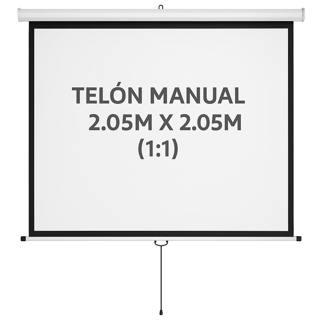 Pantalla de proyección manual de 2.05m x 2.05m en formato cuadrado 1:1. Superficie blanca mate de alta calidad con mecanismo retráctil. Ideal para presentaciones, proyecciones educativas y uso versátil en espacios reducidos.